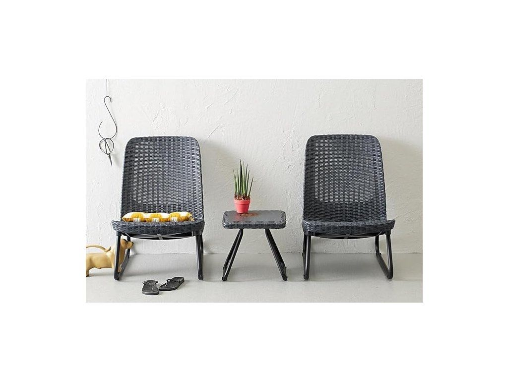 Set z umělého ratanu vhodný na balkóny, terasy či jako vnitřní posezení. Moderní 'proutěný' designdodává nábytku lehkost a vzdušnost. Pevná kovová kostra zajišťuje nábytku stabilitu. Vhodné na zahradu, terasu, do altánu i zimní zahrady možno použít i do domácnosti a do restaurací. Set se skládá z dvou křesel a stolečku v antracitové barvě. Materiál je lehce udržovatelný a omyvatelný.